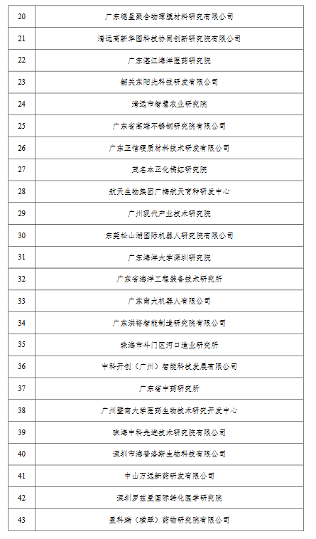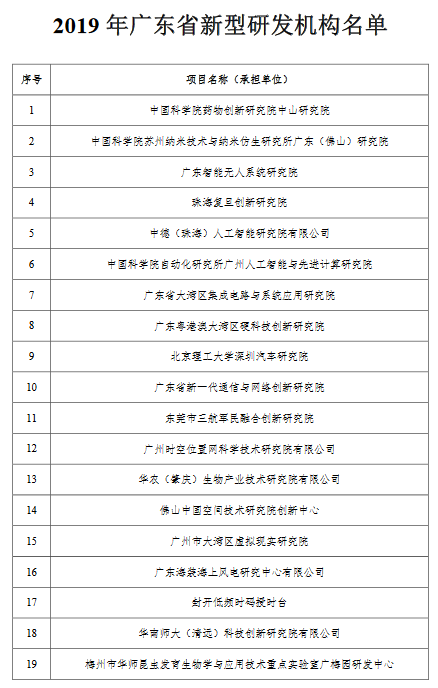 根据《广东省科学技术厅关于发布2019~2020年度新型研发机构建设指南的通知》(粤科函资字〔2019〕1309号)文件精神,经组织专家评审,现将拟认定的2019年广东省新型研发机构名单予以公示,公示期自10月15~21日,共7天。如有异议,请于公示期内向省科技厅反映。以个人名义反映情况的,请提供真实姓名、联系方式和反映事项的证明材料等;以单位名义反映情况的,请提供真实单位名称(加盖公章)、联系人、联系方式和反映事项的证明材料等。