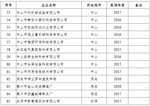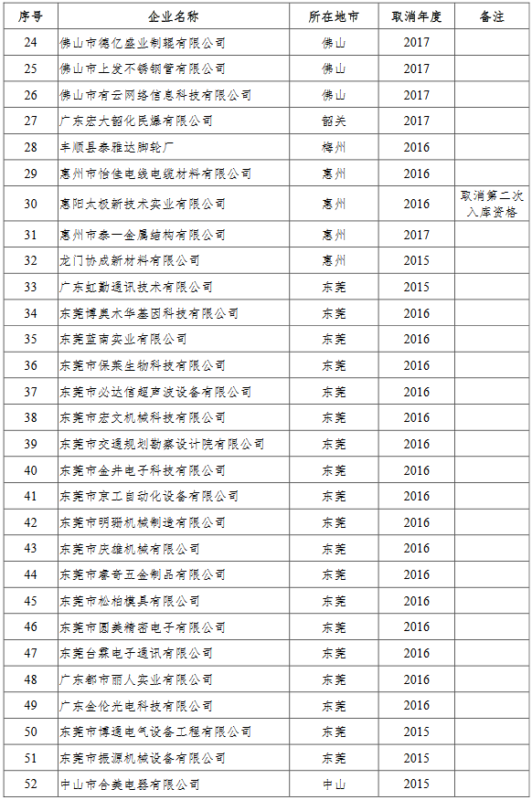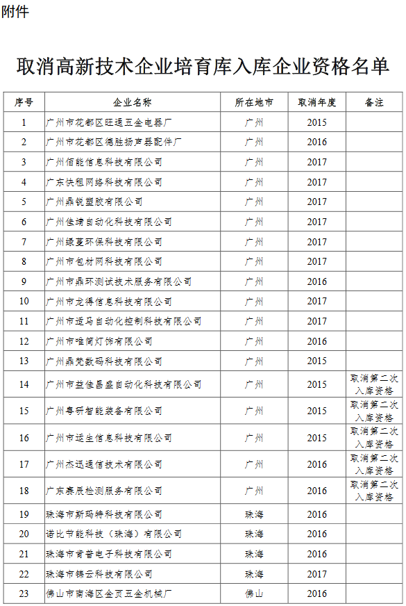 根据《广东省2015至2017年度创新型企业培育政策落实及相关财政补助资金使用绩效专项审计调查报告》(粤审教专报〔2019〕3号)反馈意见,省科技厅在地市科技部门核查基础上,对相关高新技术企业培育库入库企业的申报、评审、入库、奖补等情况进行复核,经核实广州市花都区旺通五金电器厂等59家企业不符合高新技术企业培育库入库要求、广州市益佳昌盛自动化科技有限公司等6家企业重复入库。根据《广东省高新技术企业培育工作实施细则》(粤科函高字〔2016〕1737号)有关规定,研究决定取消广州市花都区旺通五金电器厂等59家企业的高新技术企业培育库入库企业资格,取消广州市益佳昌盛自动化科技有限公司等6家企业的高新技术企业培育库第二次入库资格,相关财政资金收回按有关规定办理。