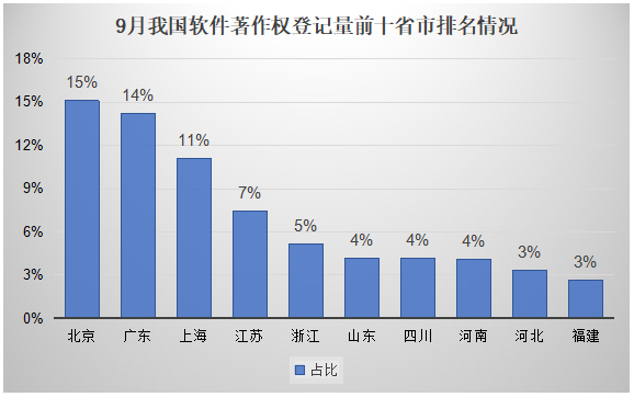 9月在我国东、中、西和东北部地区中,东部地区共登记软件著作权7万件,约占我国登记总量的66%,占比最高;东北部地区共登记软件著作权6千件,同比增长81%,增长最快。