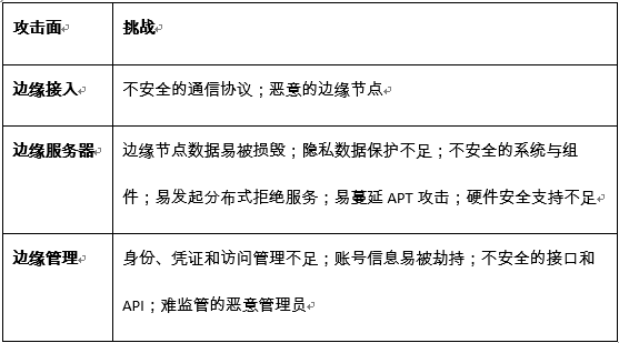 3)资源约束特征:包括计算资源约束、存储资源约束以及网络资源约束,从而带来安全功能和性能上的约束,这要求边缘安全需要考虑轻量化安全及云边协同安全等方面的能力构建;