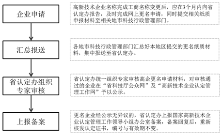 应在三个月内向所在地认定管理机构报告,并提交变更申请材料。认定机构经审核确认符合定条件的,在重新公示后,向领导小组办公室提出备案申请;不符合认定条件的,应自发生名称变更日起终止其高新技术企业资格。