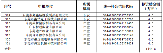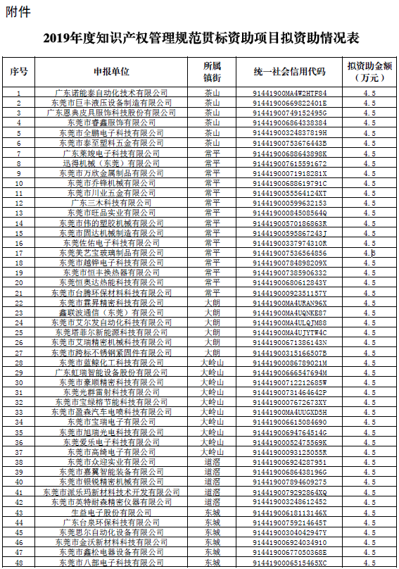 根据《东莞市专利促进项目实施办法》(东府办〔2019〕60号)的有关规定,我局组织受理并审核了2019年度知识产权管理规范贯标资助项目,现向社会公示拟资助企业名单(详见附件)。自公示之日起7天内,任何单位或个人均可向我局提出异议。