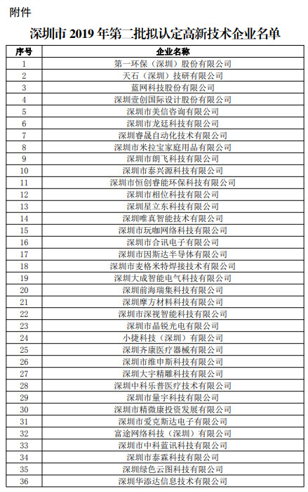 根据《高新技术企业认定管理办法》(国科发火〔2016〕32号)和《高新技术企业认定管理工作指引》(国科发火〔2016〕195号)有关规定,现将深圳市2019年第二批2840家企业拟认定高新技术企业名单(详见附件)予以公示,公示期为10个工作日。