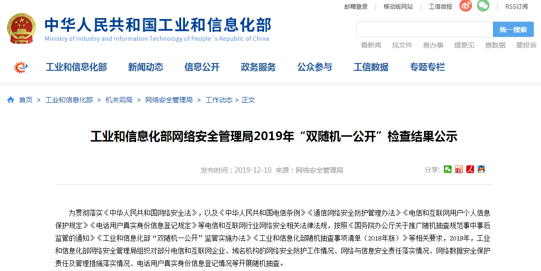 近日,工业和信息化网络安全管理局公示2019年“双随机一公开”检查结果,本次抽查共发现68家电信和互联网企业、域名机构不同程度存在违规情况。