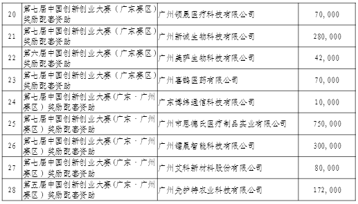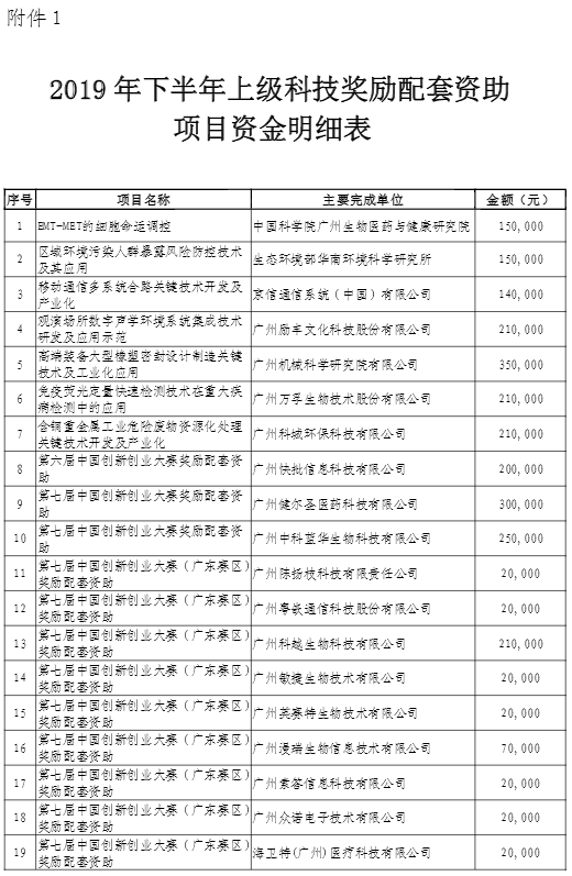 中国科学院广州生物医药与健康研究院等35家企事业单位提交的2019年下半年上级科技奖励配套资助申请材料收悉。经核定,中国科学院广州生物医药与健康研究院等28家企事业单位符合《广州市黄埔区广州开发区促进高新技术产业发展办法》(穗开管办〔2017〕7号)第四条要求,同意给予上级科技奖励配套资助,配套资助资金合计人民币肆佰叁拾陆万肆仟元整(¥4364000),具体配套企事业单位名单及金额明细见附件1。请按照以下要求办理政策兑现手续。