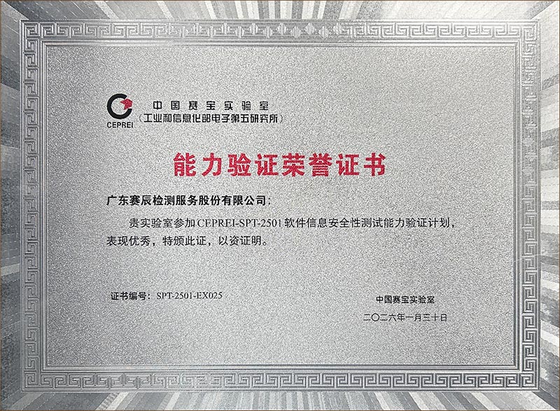 广东赛辰检测服务股份有限公司(简称"赛辰")凭借扎实的技术实力、规范的测试流程和稳定的质量管理水平,在CEPREI-SPT-2501软件信息安全性测试能力验证中严格按照能力验证要求制定测试方案,编写测试用例并反复验证,对测试结果进行科学分析,获得评审专家的高度认可,以优异成绩脱颖而出,荣评"2025年度软件信息安全性测试能力优秀实验室"称号。